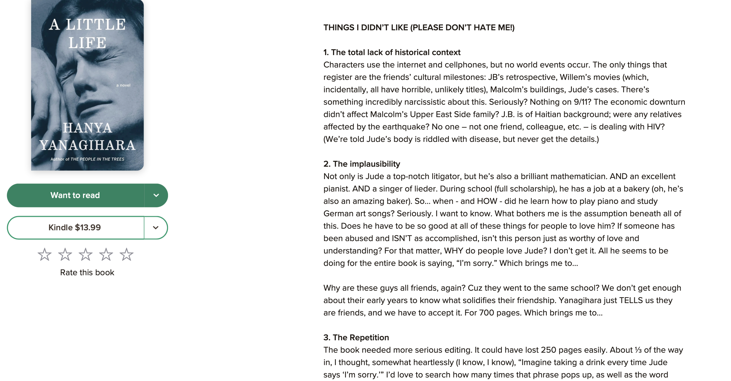 국내 리뷰에 '불행 포르노'라던가 '마케팅이 아니라 트리거 워닝을 해야 한다' 등 혹평이 많아서 해외 반응이 어떤지 궁금해서 찾아보게 되었다. goodreads 사이트 최상단에 있는 리뷰를 가져와봤다.
