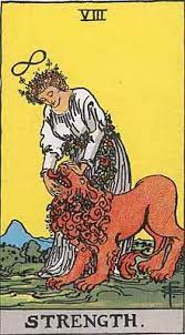 여자는 빨간 장미로 된 벨트를 두르고 있습니다. 장미는 욕망을 상징합니다. 하얀 드레스는 순수한 의도를 의미하며 욕망에 흔들리지 않는다는 것을 보여줍니다. 머리 위에는 마법사의 머리 위에 있던 것처럼 무한대의 기호가 있습니다. 이는 영원성과 지혜를 상징하며, 진정한 힘은 내면에서 나오며 고갈되지 않는다는 것을 보여줍니다. 사자는 외부적인 요소, 장애물, 욕구, 또 다른 나를 보여줍니다.